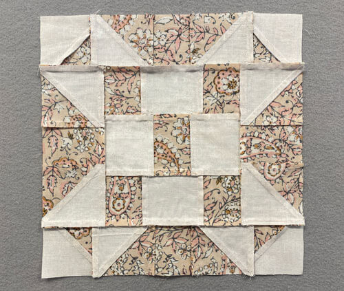 After one final turn at the ironing board, your finished Dewey Dream quilt block looks like this. A nice little star-like quilt block.