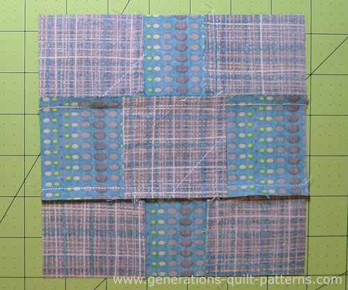 Stitch them into rows, pressing towards the #2 squares (green dots) to minimize bulk.