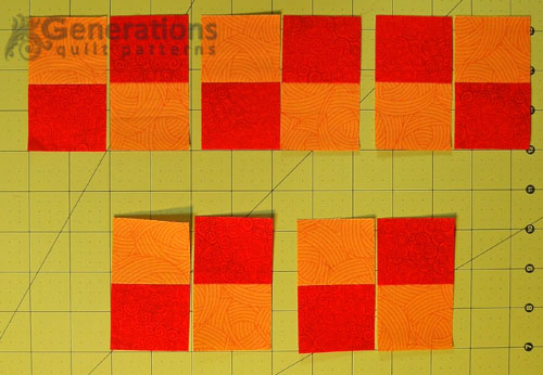 If you've used a template to cut your patches, sew 10 pairs of #3 and #4 patches, pressing to the darker fabric.