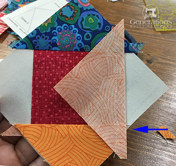 Before pressing, trim away the dog ears (it's easier to do it now). The arrow points to where the first has been trimmed away.