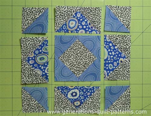 You've noticed, of course, that even though this Hour Glass is drawn on a 4x4 grid, we put it together like an uneven 9-patch.