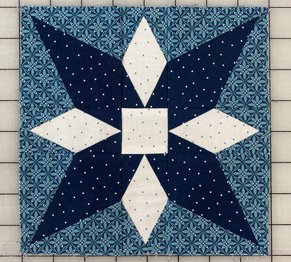 As you choose your fabrics, be mindful that those points in the four outside corners are super pointy. My fabric choices for the sample block come very close to camouflaging them, and obliterating the piecing work that went into them that pointy.