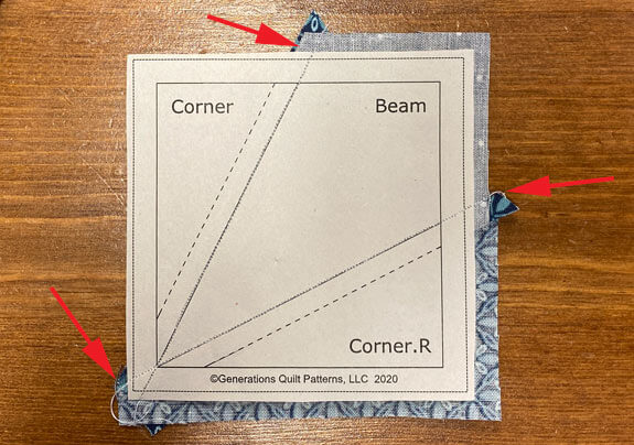 Position the 1/4" marking on your ruler over the solid outline of the DR (red arrow)After trimming all the DRs, you have units as shown below. If stitched directly on the line, each point is a perfect 1/4” from the edge.
