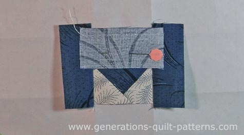 Add #6 and #7 in the same manner, making sure to center the patches on the previously stitched unit. Here #6 is centered RST with the sewn unit.