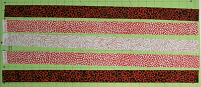 Cut two 1-1/2" segments from both the dark and medium fabrics and one at 1-1/2" from the lightest fabric. Remember we need to add seam allowances—¼" to both sides of the strip.