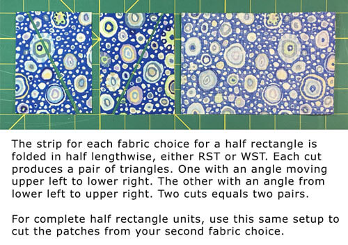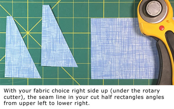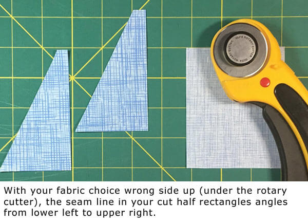 When you cut the strips either both right-side up or both right sides down, you end up with matching units...only the direction of the seam line changes in the finished half rectangle triangles.
