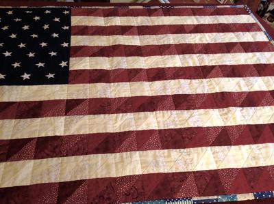 The blue starred fabric is a panel and the backing fabric is a lucky find from a quilt show I attended in Malvern, England. I ditch quilted it myself.