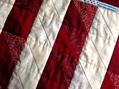 It's only 50" by 35" but this is the biggest quilt I have made so far. It's just 2.5" Half Square Triangles sewn together into red and ivory stripes, so I'm glad I found your tutorial on making HSTs eight at a time as it really helped me along!!