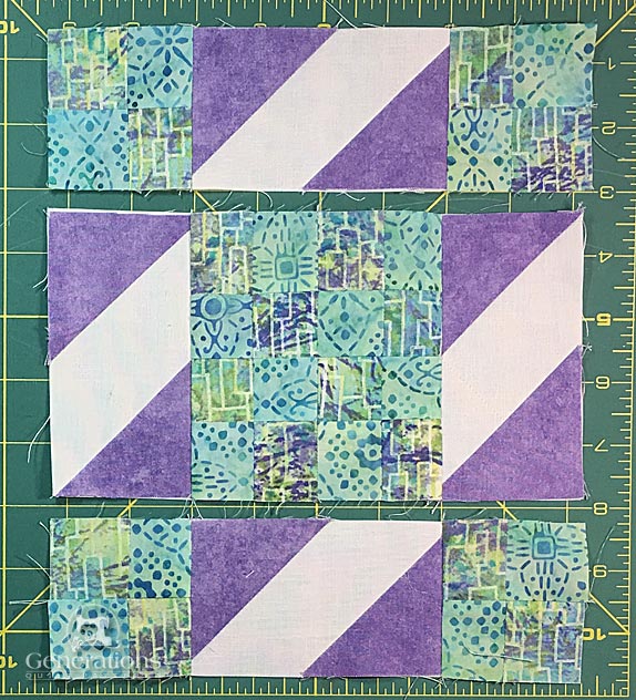 Stitch the units into rows. SA are pressed toward the four-patches.