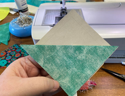 You can just make out the shadow of the #1 on the unprinted side of this pattern.With RST, center the long bias edge of a #2 triangle even with one edge of the #1. The point of the triangle is directly opposite the printed solid corner lines on the pattern. at the top of the photo.