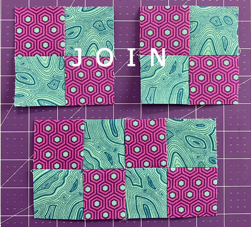 SA twirl or fan clockwise around the unitWith RST, pin two of the four patches together so that the #6 patch (purple) feeds through your sewing machine first.